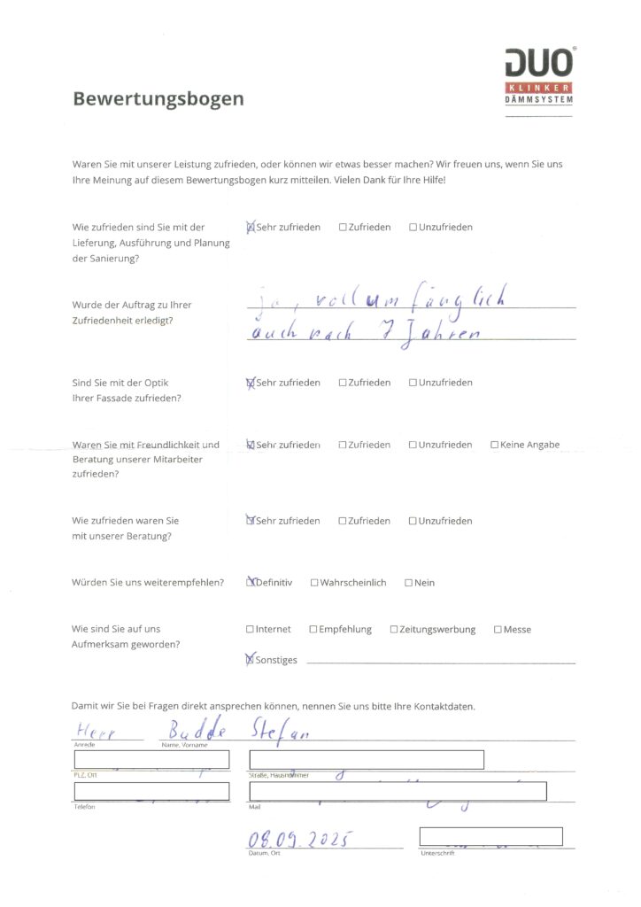 „Ja, vollumfänglich, auch nach 7 Jahren.“ – Herr Budde auf die Frage der Zufriedenheit